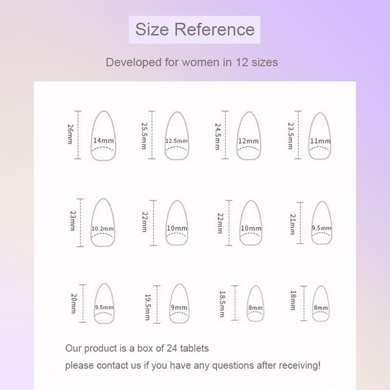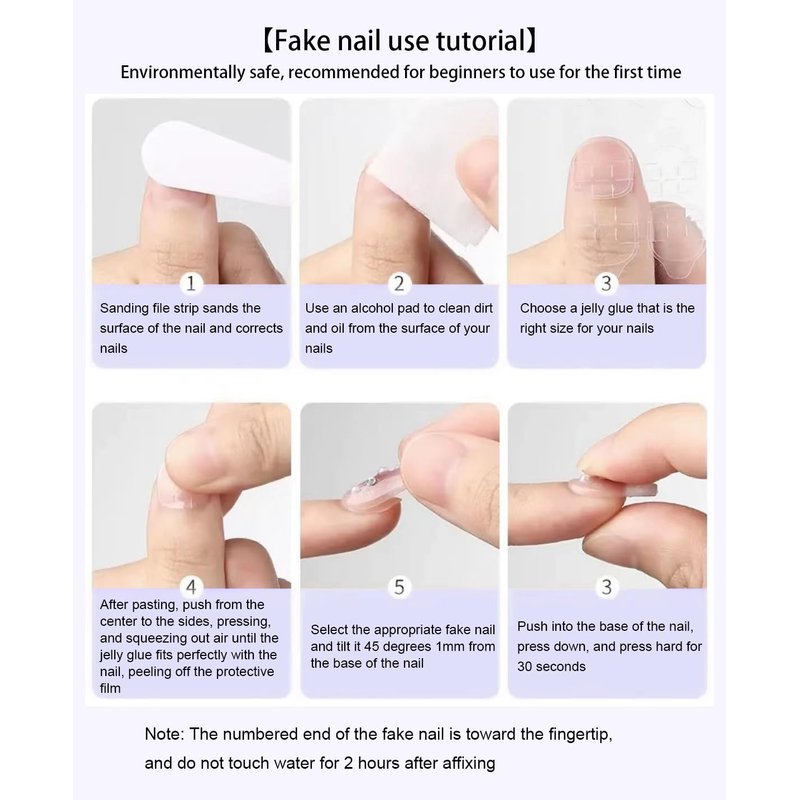 How to use 1. Use a rub to polish the nails, exfoliate the surface, rinse and keep the nails clean and dry. 2. Choose the right size nail piece and use the jelly glue from IFMOPETY. 3. Leave a distance of 1mm from the base of the nail when applying the jelly glue,press from the center to the sides to expel excess air, making the jelly stick more snug to the nail 3. Push the fake nail at a 45-degree Angle toward the base of the nail for 1mm, then press down again to expel excess air,hold them for 30 seconds. 4. Trim according to the shape and length of the press on the nail you want. How to remove Soak your nails in warm water and gently peel off the pre-glued nails from the side after a few minutes,or use alcohol spray on fake nails Note Because each display is different, the product may have color differences, please don't worry, this is a normal phenomenon. If you have any questions, please contact us in time, and we will solve them for you Thank you for your love and support of IFMOPETY