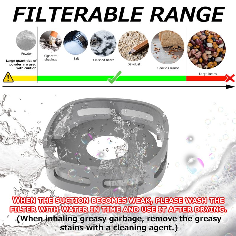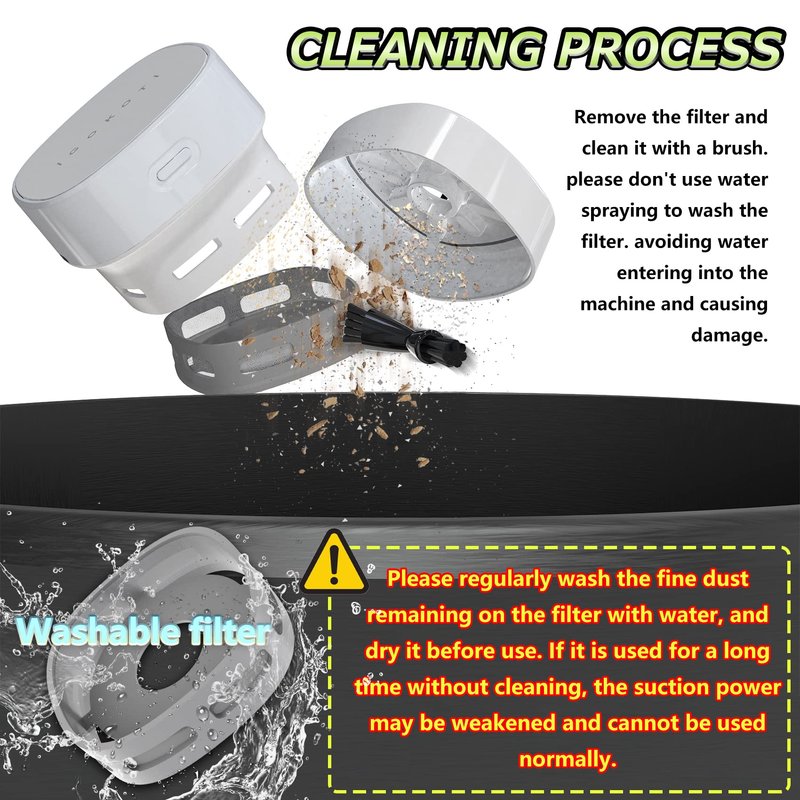 - 【NOTE】It is not recommended to clean up fine powder garbage, which is easy to block the filter.If the vacuum cleaner is used more than twice, the filter needs to be cleaned or rinsed in time, otherwise it will affect the suction power.