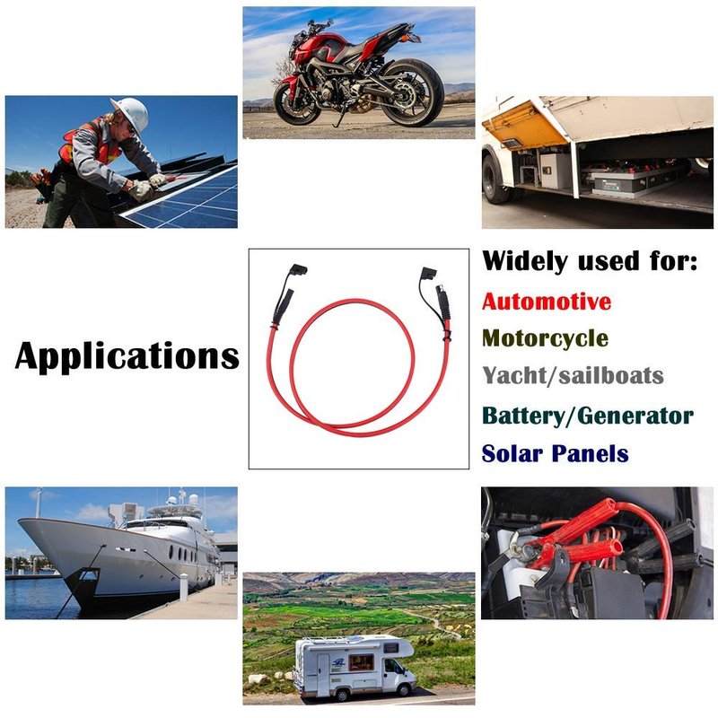 - 2 pin extension cord with Universal SAE connector, can be widely used in all kinds of vehicles and devices, such as automotive, motorcycle, lawn mower, RV, trolling motor, ATV, kayak, tractor sprayer, power inverter and other devices with sae ports. Also you can DIY with the cable, just need your brain and hands. Cut off end of and attached ring terminals for battery connection.