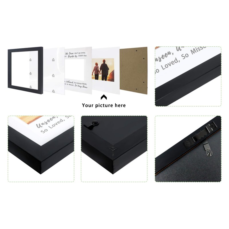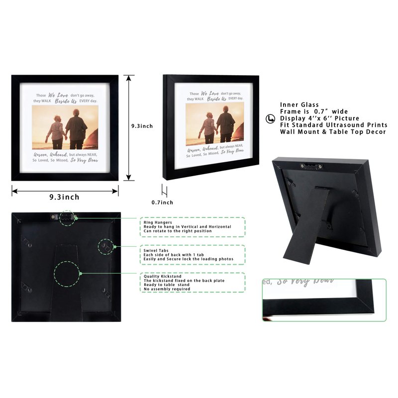 - 【FRAME QUALITY】- The inner board size 8x8 classic black photo frame can hold 4 x 6 horizontal photograph and can be displayed on home or office tabletop. The outer size is 9"X9".And all mats are printing with silver color words.This is a high quality perfect photo frame with plexiglass and mat to display loved some photograph, is suitable for many styles of decor