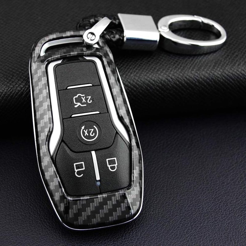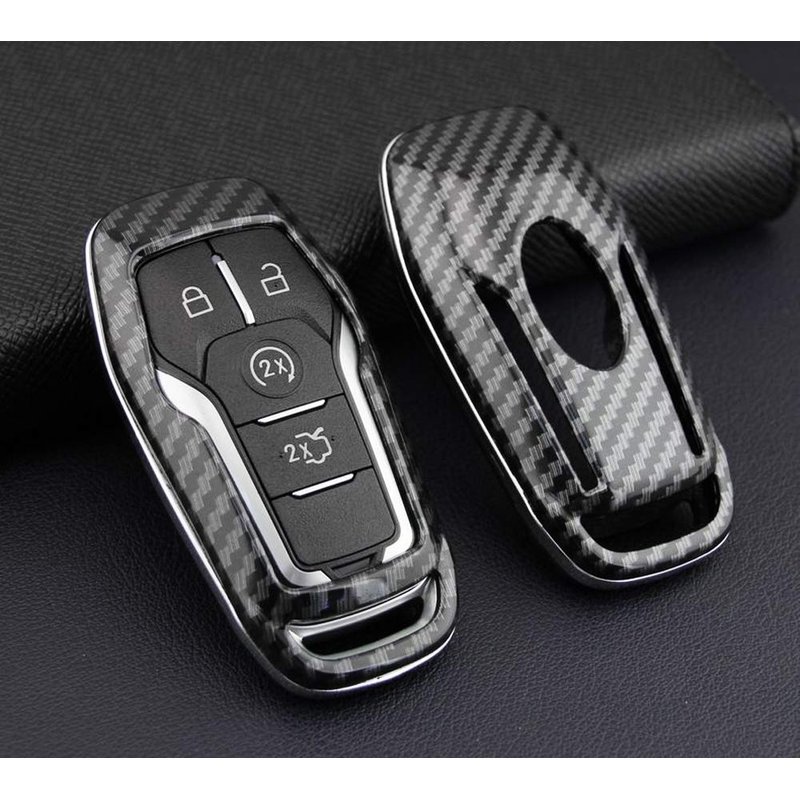 This page features a brand new set of iJDMTOY Glossy Black Carbon Fiber Pattern Exact Fit Key Fob Shell w/ Keychain Compatible with Ford/Lincoln 4/5-Button Intelligent Access Smart Key.