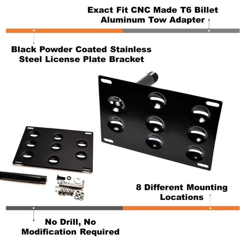 - No drill/modification required for the installation: 1) Remove the front tow hook cover cap, 2) screw in the adapter rod (receiver/holder) into the tow hole, 3) attach the license plate frame/bracket, 4) bolt-on your license/tag
