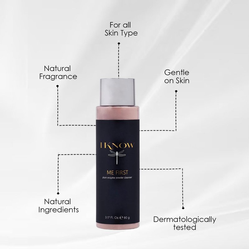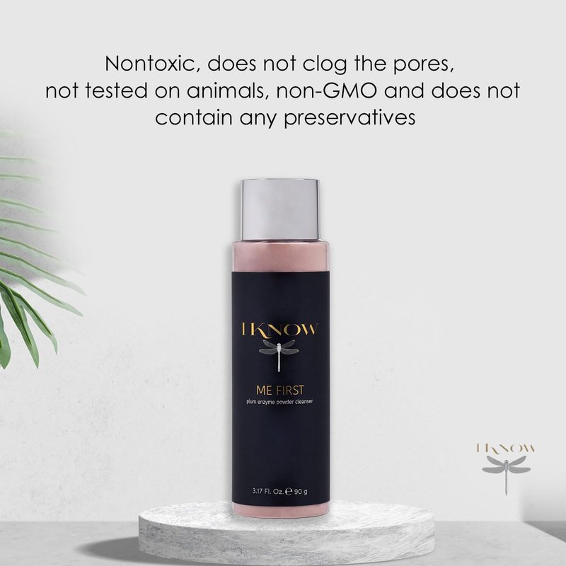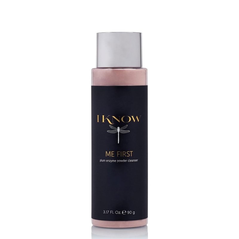 ME FIRST Plum Enzyme Powder Cleanser. ME FIRST ingredients work synergistically to: Improve skin elasticity. Improve cell renewal. Gently exfoliate. Minimize blackheads. Promote a radiant and balanced complexion. 3.17 Ounce | 90 Grams. Suggested Use: Every morning and evening shake a small amount of IKNOW ME FIRST into the palm of your hand or onto a damp cleansing tool. Add water or IKNOW IMMERSE to activate and lather. Gently massage over your face, then rinse thoroughly. Pat dry. Follow with IKNOW IMMERSE. For best results use the other IKNOW day time products. Product Information: Ingredients: Pink Clay, Zea Mays (Corn Starch), Sodium Cocoyl Isethionate Powder, Sodium Lauroyl Glutamate, Musa Spp (banana) Powder Fruit(Extract), Allantoin, Betaine, Kakadu Plum Powder, Aloe Barbadensis Leaf Juice, Apple Fruit Powder, Avena Sativa (Oat), Kernel Colloidal, Oatmeal (Grade 10), Sorbitol, Ascorbyl Palmitate, Citric Acid. No mineral oils, no synthetic colors, no synthetic fragrance, or animal testing Caution: For external use only. Avoid eye contact. Keep out of the reach of children.