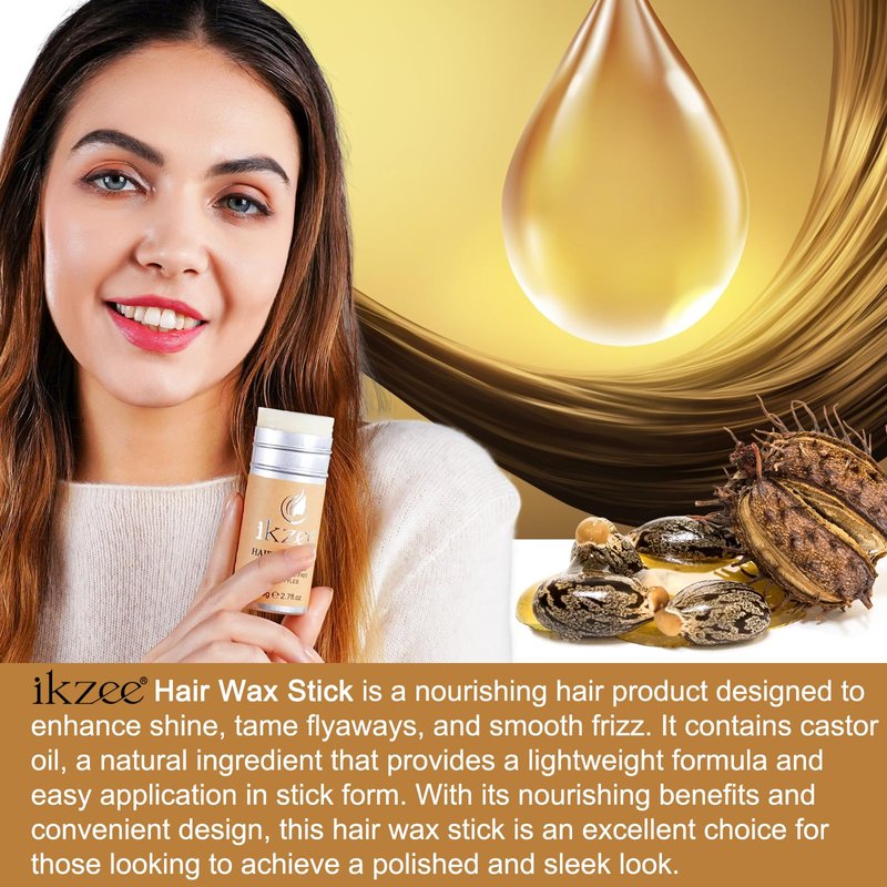 - Hair wax stick ontains castor oil, a natural ingredient that provides a lightweight formula, is designed to enhance shine, and smooth frizz. With its nourishing benefits and convenient design, this hair wax stick is an excellent choice for those looking to achieve a polished and sleek look.