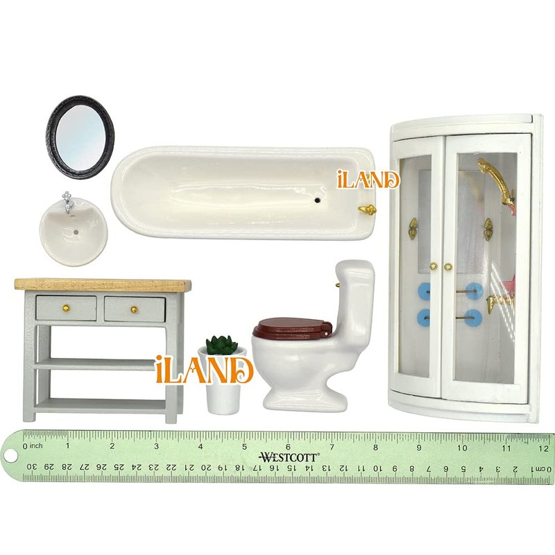 - - REALISTIC DESIGN: Made of high-quality ceramic, the mini bathtub, sink and toilet are smooth with charming ceramic lusters. The bathroom vanity is made of wood with eco-friendly varnish. The shining glass mirror is waiting for the lovely role dolls. The modern shower enclosure is rich in details and looks delicate. With the potted plant, this dollhouse furniture set will make a realistic mini bathroom even under a close-up shot.