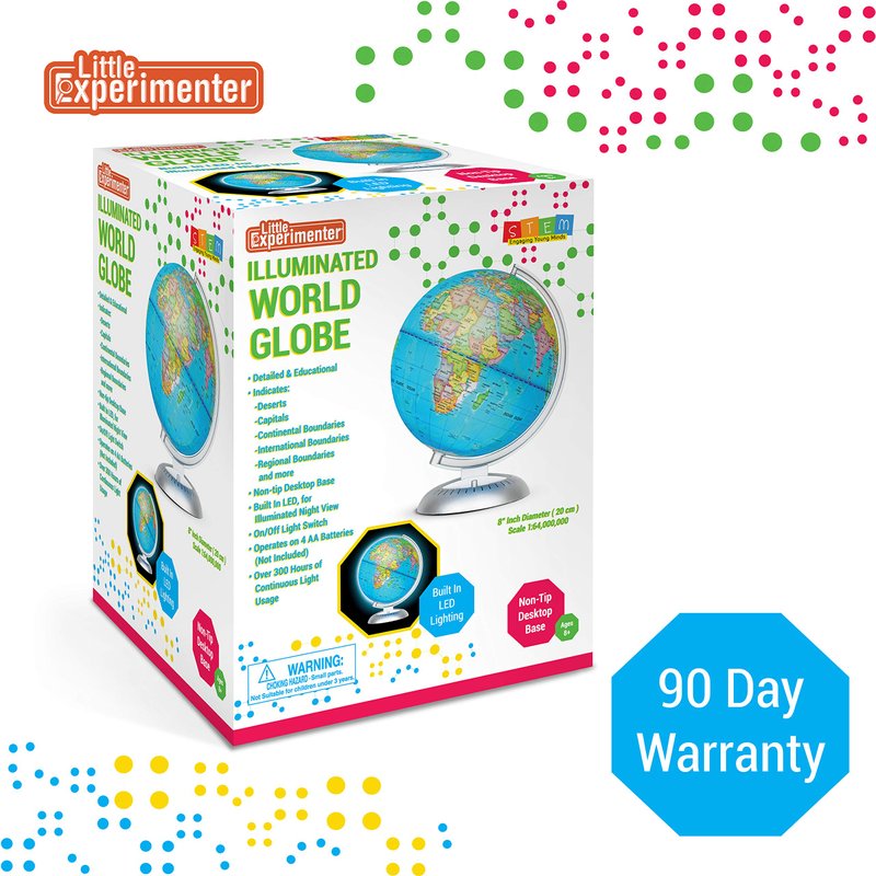 Introducing the Little Experimenter 3-in-1 World Globe for Kids Learning. This 8" globe is a perfect educational tool for children ages 8 and up. It displays countries, capitals, deserts, and borders, providing an interactive learning experience. The globe also lights up in the dark, revealing a star constellation map that sparks curiosity about astronomy. With its built-in color-changing nightlight projector, it creates a soothing ambiance for bedtime. This globe supports STEM learning and encourages children to explore the world around them. Batteries are required for operation. Give your child the gift of knowledge and adventure with this captivating world globe.