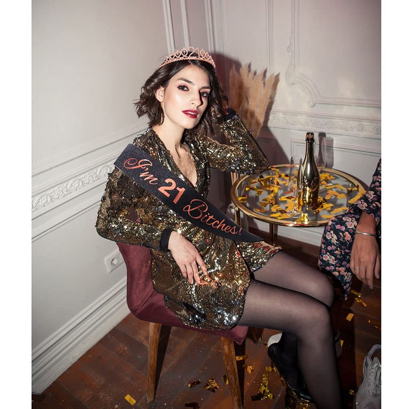 "I'm 21 Bitches!" Sash & Rhinestone Tiara Set - 21st Birthday Gifts Birthday Sash for Women Birthday Party Supplies (Black Glitter/Rose Gold)