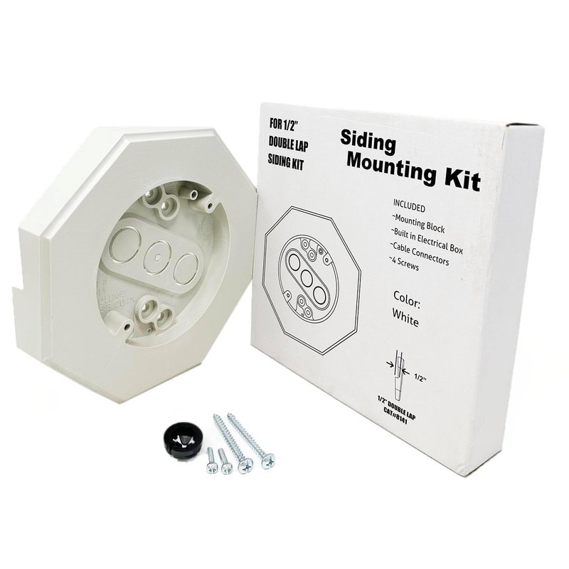 - Functionality: The built-in box is likely designed to house the electrical connections and wiring associated with the outdoor lighting fixture, helping to protect them from moisture and other environmental factors. Compatibility: The kit is specifically designed for use with vertical siding that is 1/2 inch (0.5 inches) thick. It provides a secure and stable platform for attaching outdoor lighting fixtures to this type of siding.