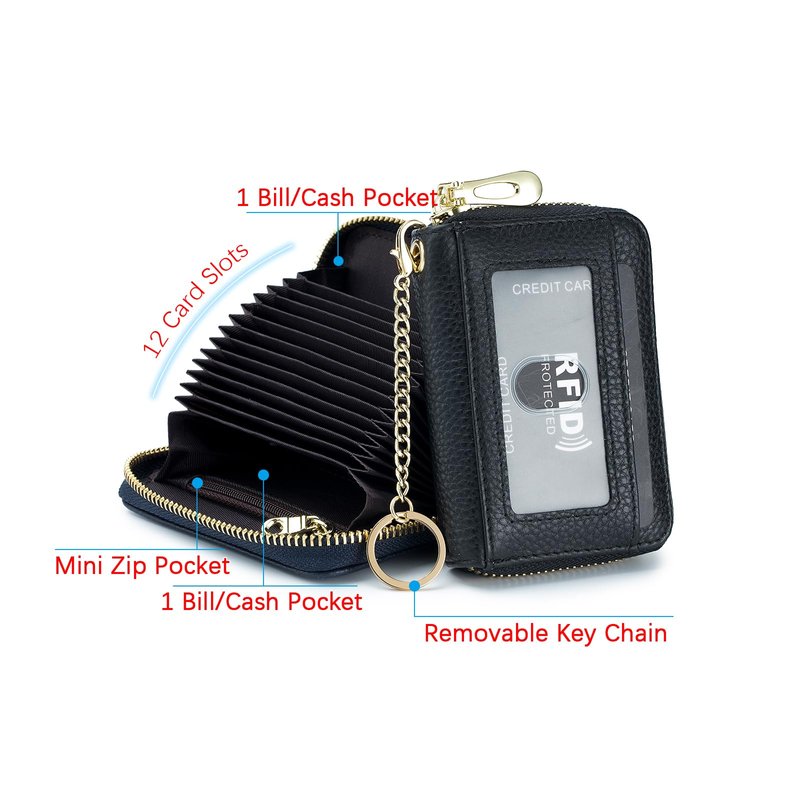 - Perfect Size to Organize Almost Everything: 4.3 x 3 x 1.2 inches. There are 12 card slots for at least 12 cards, 2 wide slots for bills, folded cash, receipts, and a tiny zipper pocket for coins. The sturdy keychain can attach your keys firmly.
