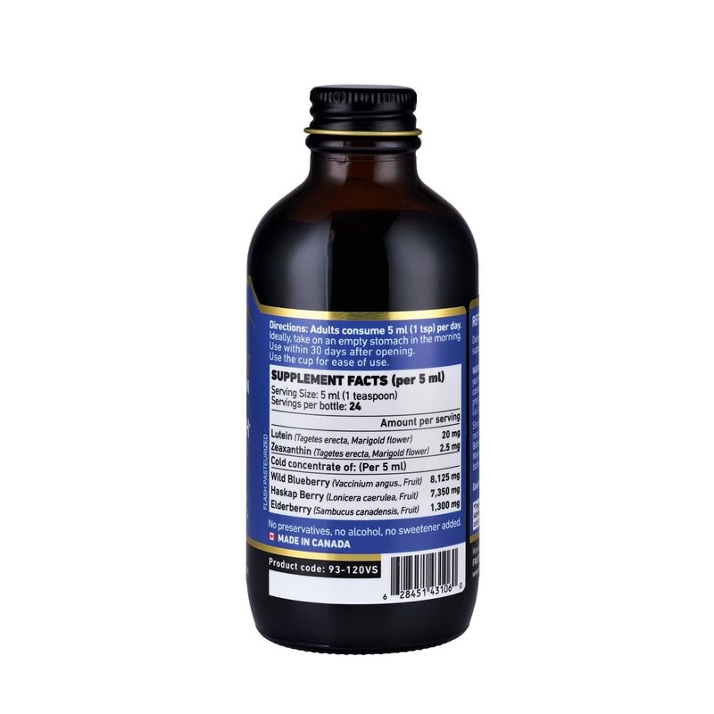 - INGREDIENTS per 5 ml dose: Lutein 20 mg, Zeaxanthin 2,5 mg. Concentrate of: Wild Blueberry 8,125 mg, Haskap berries 7,350 mg, Canadian Elderberry Sambucus canadensis 1,300 mg. Highly concentrated extract through a cold process to preserve the polyphenols antioxidant properties.