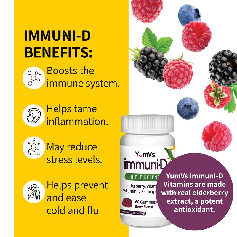 ImmuniD Elderberry Gummies by YumVs | Triple Defense Vitamins with Sambucus Elderberry, Vitamin C & Vitamin D | Complete Immune System Support for Women & Men | Natural Berry Flavor-60 Count