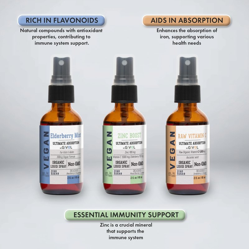 Our unique three-pack bundle of Elderberry, Vitamin C, and Zinc Boost Mists offers a comprehensive approach to health and wellness. The Elderberry Mist, rich in flavonoids and vitamins, enhances immune function, while the Vitamin C Mist, derived from organic lemon and orange fruits, is essential for those who cannot naturally synthesize this nutrient, aiding in iron absorption and promoting healing. Zinc Boost Mist supports not just the immune system, but also plays a vital role in gene expression, DNA repair, and maintaining skin health and integrity. This potent combination of antioxidants and essential nutrients in a convenient package ensures a well-rounded routine for overall health maintenance, simplifying your daily wellness regimen while providing robust support for your body's various needs.