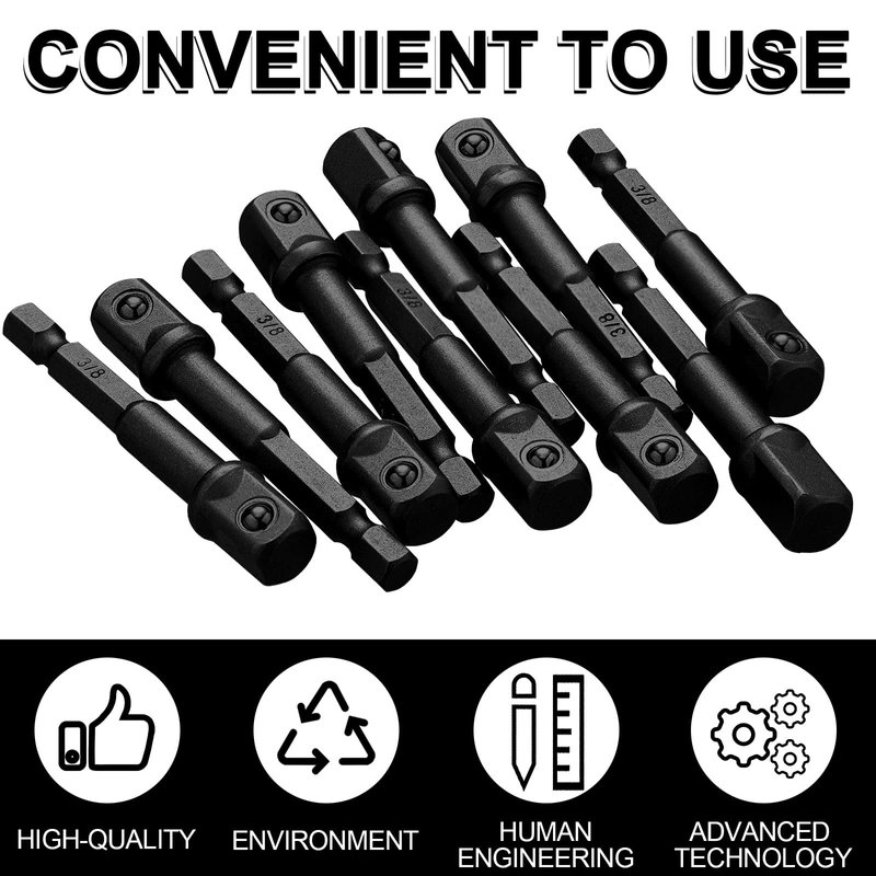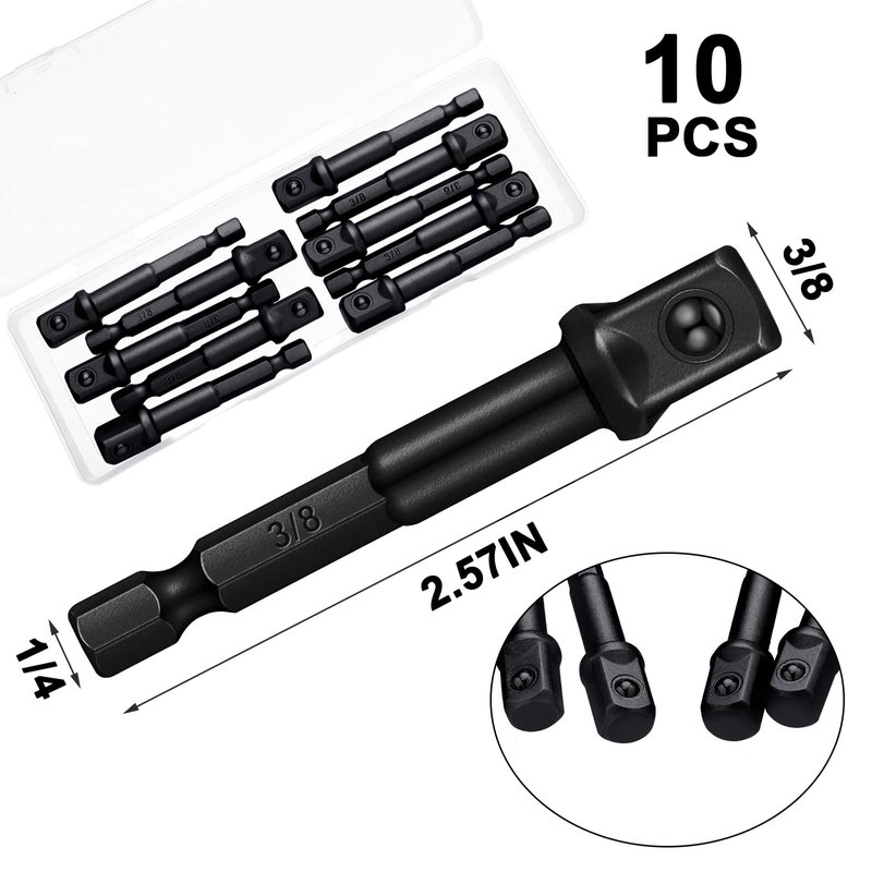 The total length of each socket adapter is about 6.5 cm/ 2.6 inches, the size of the square tip is about 10 mm/ 3/8 inch, and the size of the hexagonal handle is about 6.3 mm/1/4 inches, suitable for quick replacement of adapters, extensions, drill clips head.