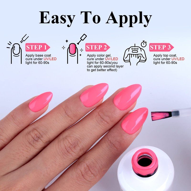 - đ ă0.5 Fl Oz Gel Polish KităCompared with other 0.2 Oz or 0.27 Oz small capacity, our Big Capacity gel nail polish set are more durable enough to use. This neon pink gel nail polish is essential for everyone, and any shade of pink nail polish is suitable for spring, summer, fall, winter.