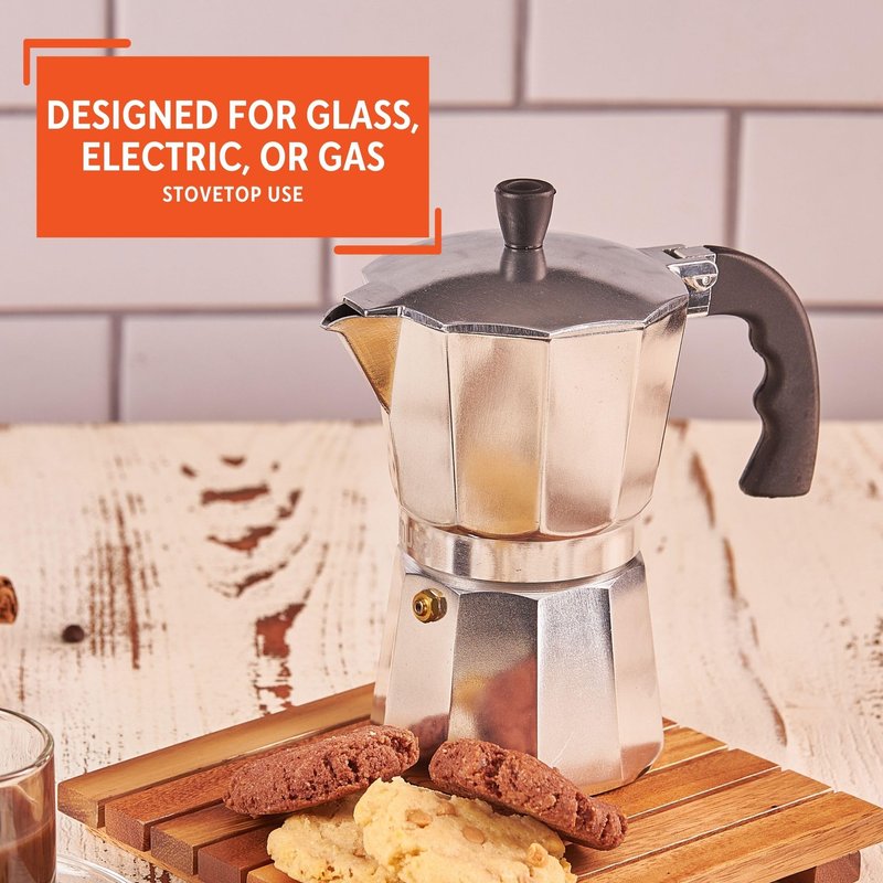 - Safety Pressure Release Valve located on the bottom half, Permanent/Removable Coffee Filter, For Use on Glass, Electric, or Gas Stovetops