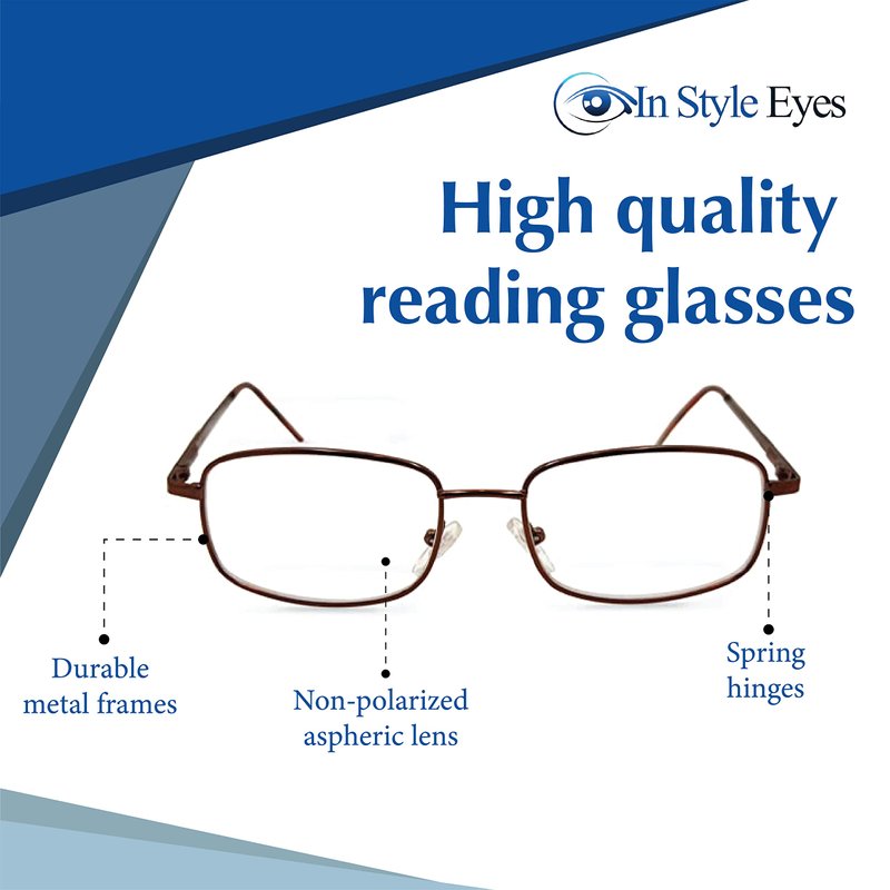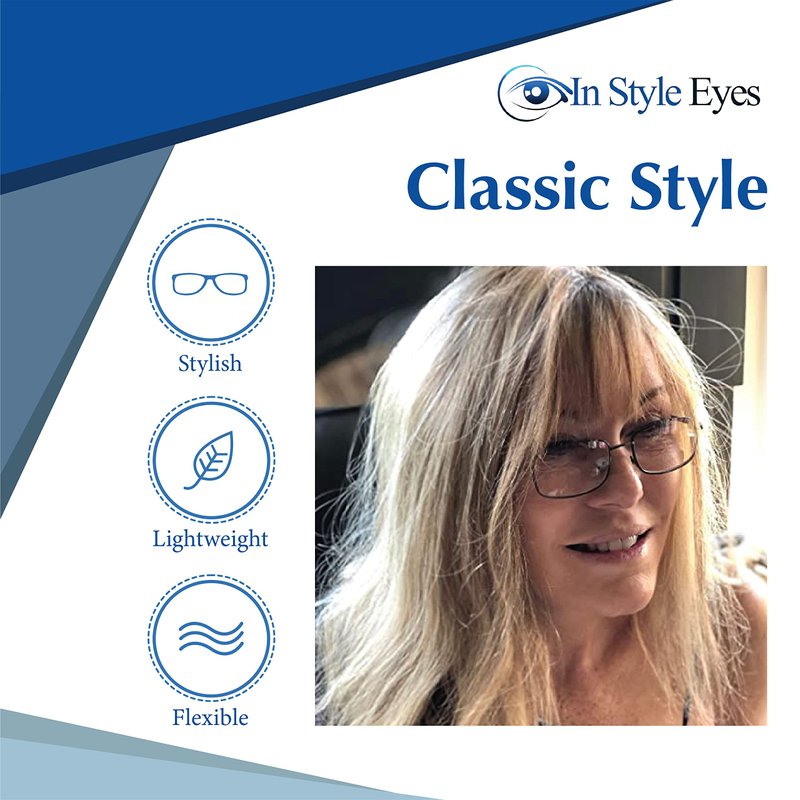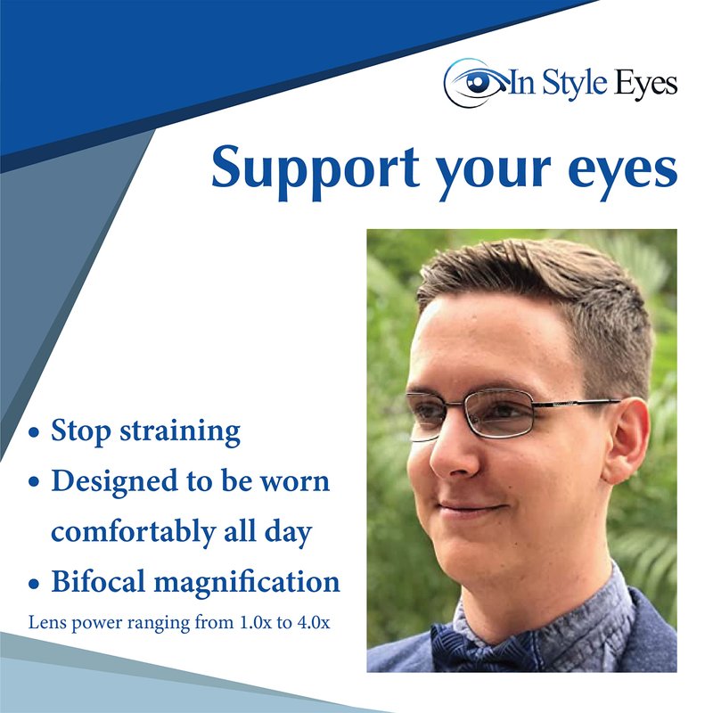 - Be in style with In Style Eyes - Recover your love for reading while being in style. In Style Eyes takes pride in designing high-quality and stylish solutions to common eyesight needs. Reading glasses aren't just for the little old lady set. All frames are designed to keep you looking au courant no matter what your age. If you have macular degeneration or cataracts, a visit to your ophthalmologist can help you determine which magnification is best for you.
