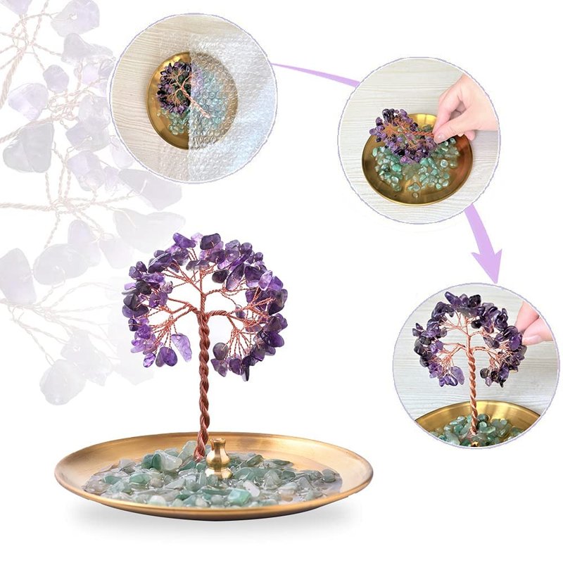 - Material: Handpicked natural purple crystals on the tree, artificial mini pond in round metal tray.