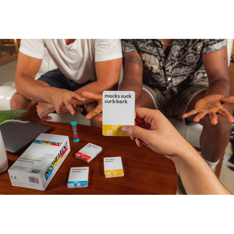 - HOW TO PLAY: A rotating judge flips the timer and holds a card up so that only they can see the answer, but everyone else sees the Incohearent phrase. Everyone else reads the front of the card aloud. Whoever decodes the phrase first wins the card. When the card has been decoded or the translators have elected to pass, the judge pulls the next card. Once the timer runs out or 3 cards have been decoded, the round is over, and the next person becomes the judge. First player to decode 13 cards wins!