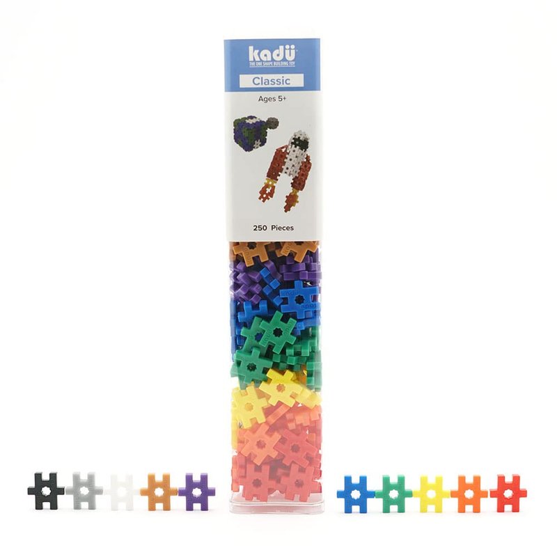 - Jump right in with the easy to learn one piece building toy Kadu! The 250 piece Classic set comes with 10 colors. It has the six basic rainbow colors in addition to black, white, grey, and brown. It is the perfect start to your KADU collection!
