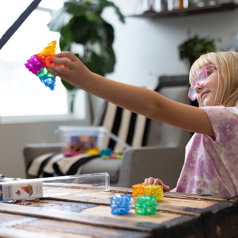 ZAZ makes magnetic block building even more fun and easy! The magnets rotate inside the block so there is never a wrong way to connect the blocks to one another. Younger builders will have a blast simply letting the blocks snap together and build chains and towers. While more advanced builders can use the faceted surfaces to construct three-dimensional models in all directions.