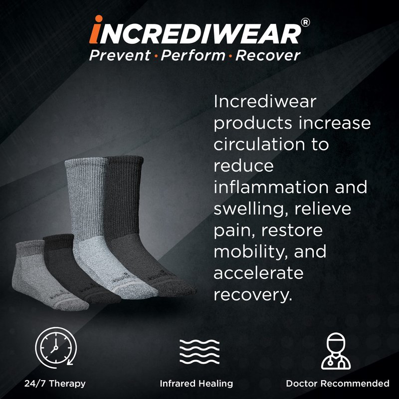 - IMPROVE POOR CIRCULATION: Incrediwear's wearable inflammatory therapy signature fabric blend is embedded with semiconductor elements to increase blood circulation and help accelerate recovery. The non-binding loose weave design allows for a form-fitting feel without the discomfort of compression socks.
