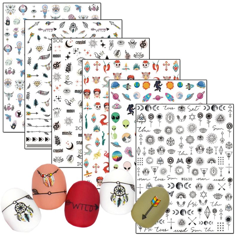 - Quantity: 6 Sheets Indian nail art decals, each paper measures 4.1 x 3.1 inches(10.3 x 8 cm). Contains a variety of patterns: Mysterious alien, Feather, Ancient tribal totem, UFO, Sun, Moon, Star, Eyes, Skull, Crocodile, Arrow, etc.