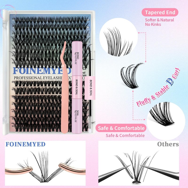 Why FOINEMYED DIY Individual Lashes Kit? Discover the incredible value and affordability of our DIY Individual Lash Kit! FOINEMYED Cluster lashes strike the perfect balance between budget-friendly prices and premium quality. Effortlessly experiment with eyelash extensions at home for a self-application experience! How to Apply FOINEMYED Lash Clusters? Step 1: Choose the number and length of lash clusters according to your eye type and preference. Step 2: Curl your natural eyelashes and brush a thin layer of cluster lash glue under your own eyelashes. Step 3: Pick up the lash cluster from the root with tweezers, then put it under your natural lashes, 2-3mm away from your eyelid, and press carefully. Step 4: Brush a thin layer of eyelash seal to get a long-lasting shape. Step 5: Close your eyes as needed and blink to ensure a perfect fit. To make your eyelash extensions look more natural, use eye makeup or eyeliner as needed. Everything just for you. If you have problems or suggestions for our lashes, please contact us. Opt for our cluster lashes and let your beauty radiate!