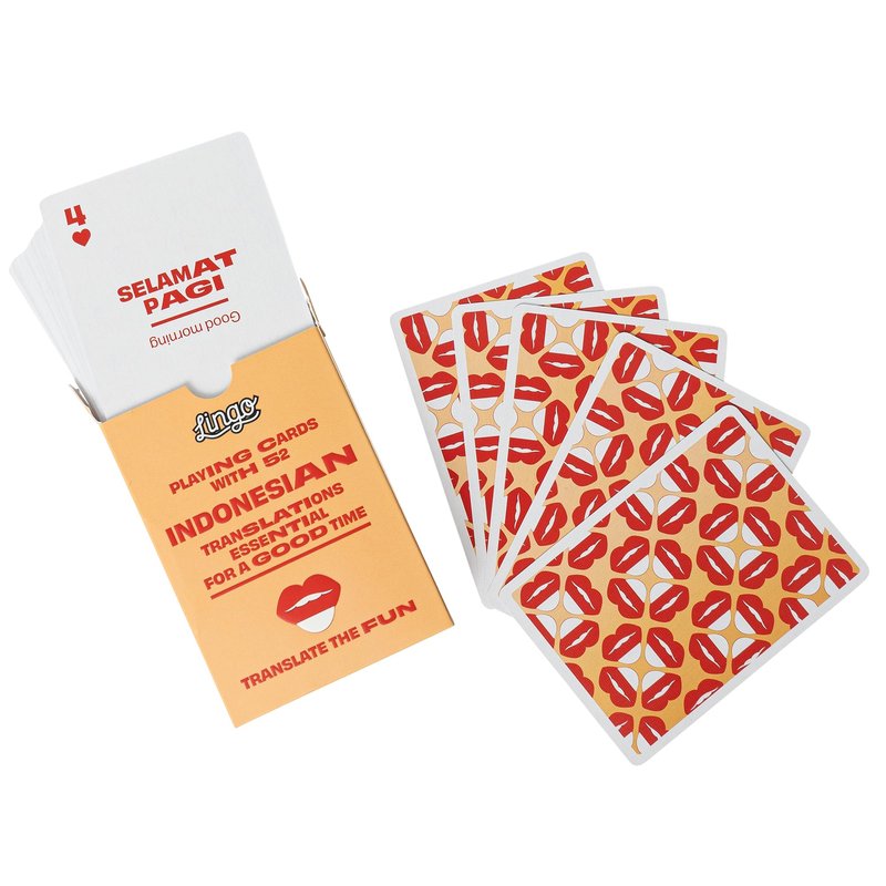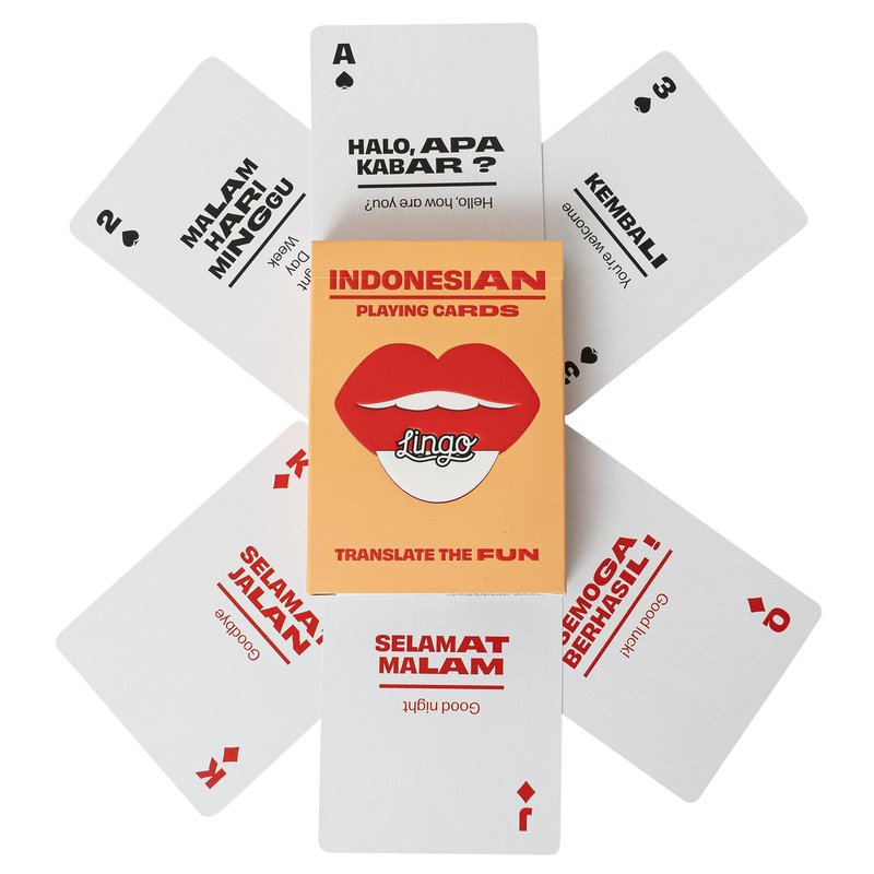 - EXPLORE AND PLAY ENDLESS –Add a touch of class and a dash of bilingual fun to your next game night. You can now learn Indonesian phrases and play your favorite card games like Poker, Black Jack, Spoons, Rummy, Go Fish, Memory, Crazy Eights, Hearts and Solitaire. Trust us, with these cards in your hand, you'll be the one everyone's talking about. Order your Lingo Playing Cards today and get ready for the most fun and exciting game night yet!