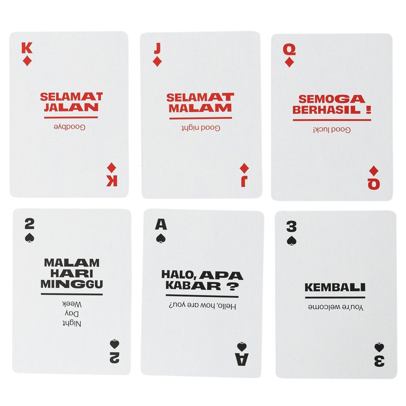 - STANDARD PLAY DECK - Each deck of cards has 54 of the most useful phrases to know in Indonesia, complete with phonetic pronunciations, and features a conventional deck of 52 playing cards and two jokers. These flash cards provide an introduction to common Indonesian lingo and are ideal for language learners just starting out.