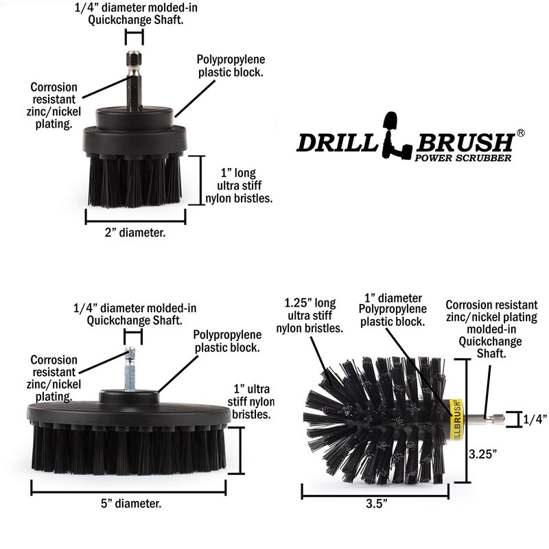 - Power Scrubber: Crafted from ultra-stiff nylon bristles, our brushes are up to any cleaning task, whether you're removing stubborn dirt, grime, rust, or even graffiti. The sleek black design not only looks professional but also signifies the robustness and strength of our brushes. The versatile drill brush set transforms your cordless drill into a powerhouse for household cleaning tasks, backyard accessories cleaning, and rust removal.