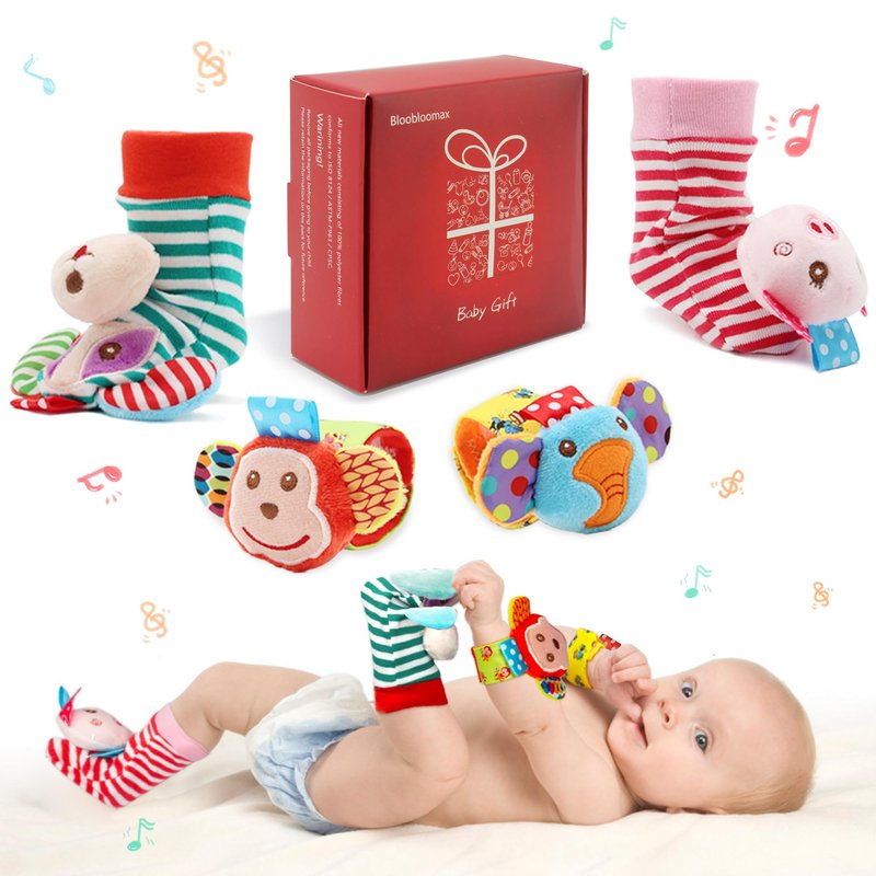 - CUTE DESIGN -- All Wrist Rattles and Foot finder socks have bells inside, wrists rattles attach with hook and loop, easy to put on and off. Baby socks with breathable and soft knitted fabric,very comfortable for little babies to wear.