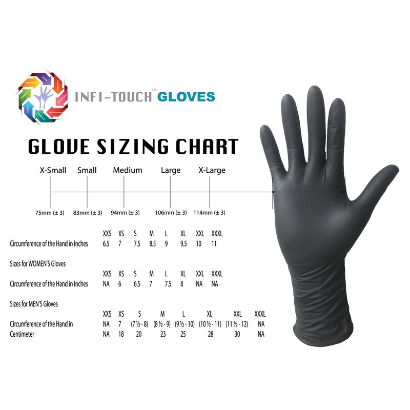 Infi-Touch Gloves combine the protection of Nitrile with the sensitivity of Latex. Our manufacturing process boosts the glove's tensile strength (the force to break through the glove) to increase its already superior barrier protection. The process boosts glove thickness, so less force is required to stretch the material. The result is a powder free glove with dexterity and sensitivity. This glove is great for use in cleaning, maintenance, cleanup, tattoo, Law Enforcement, Homeland Security, Laboratory & more. These non-sterile ambidextrous gloves are puncture and abrasion resistant and provide resistance to a wide variety of chemicals. Each box includes 100 gloves (50 pairs).