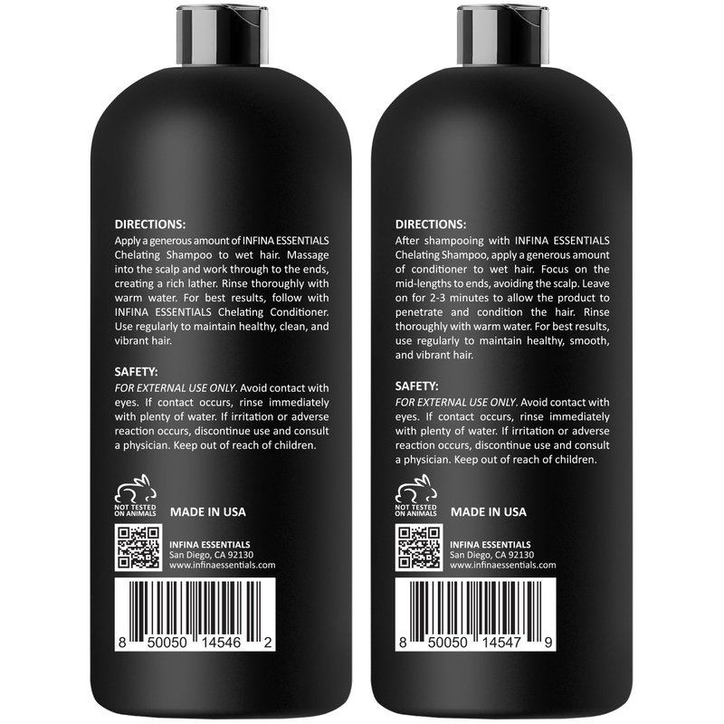 Experience the ultimate hair care solution with Infina Essentials Chelating hard water wellness shampoo and conditioner Set. This powerful ion hard water shampoo & conditioner set is specially Formulated for those combating hard water hair treatment and swimmer’s hair. Infused with our exclusive Chelactik-3 Complex, our hair build up remover provides thorough deep cleansing and mineral removal, ensuring your hair remains clean, healthy, and vibrant. Enhanced with natural Lavender and Rosemary Oils, our metal detox shampoo & conditioner nourish and revitalize your scalp, leaving your hair soft, manageable, and full of life. caters to all hair types, ensuring soft, manageable hair with a healthy shine. Ideal well water shampoo & conditioner for curly hair & oily hair. Elevate your hair care routine with Infina Essentials clarifying shampoo and conditioner