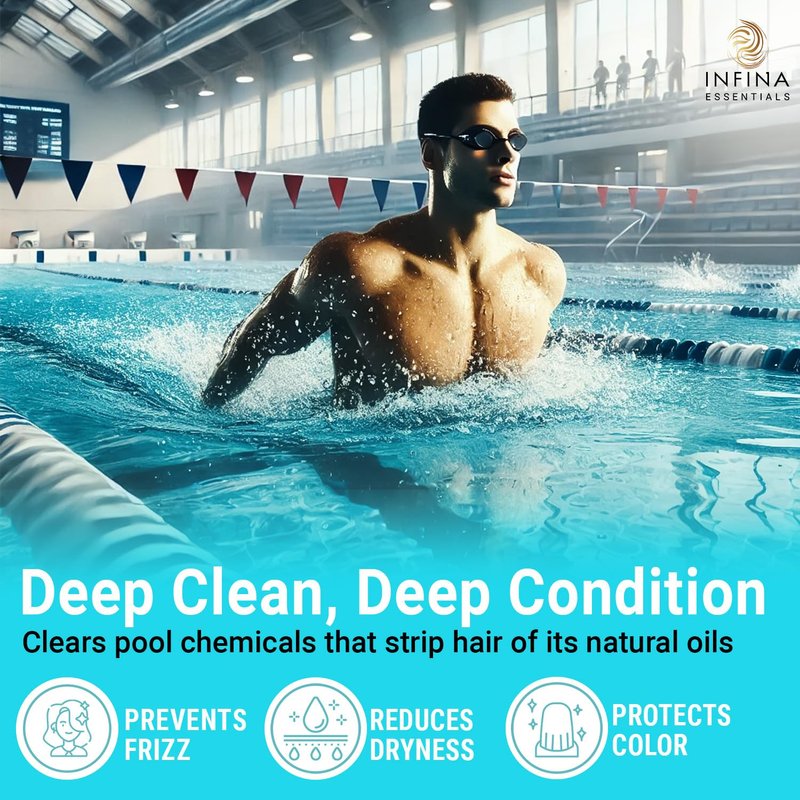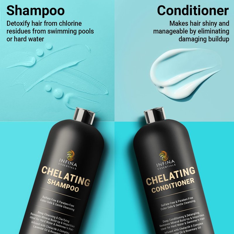 - Swimmers' Solution: Designed specifically for swimmers, our swimmers shampoo and conditioner remove chlorine and mineral buildup, maintaining your hair's natural shine and texture. This metal detox shampoo and conditioner duo is perfect for those who need a thorough cleanse after swimming.ir's natural shine and texture with the benefits of our specialized swimmers shampoo and conditioner.