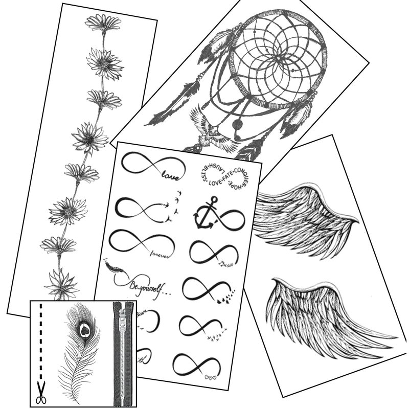 Bumper "Infinity Dreams" pack of temporary tattoos featuring 5 feminine designs and 2 copies of each. Mixed sizes from 2" to 3.5" and some finger sized / wrist infinity tattoos. Pretty tattoos that look super relaistic. Easy to put on with water and a sponge/flannel. Quality transfer tattoos Suitable for ages 3+ Skin safe, non toxic, not suitable for sensitive skin.