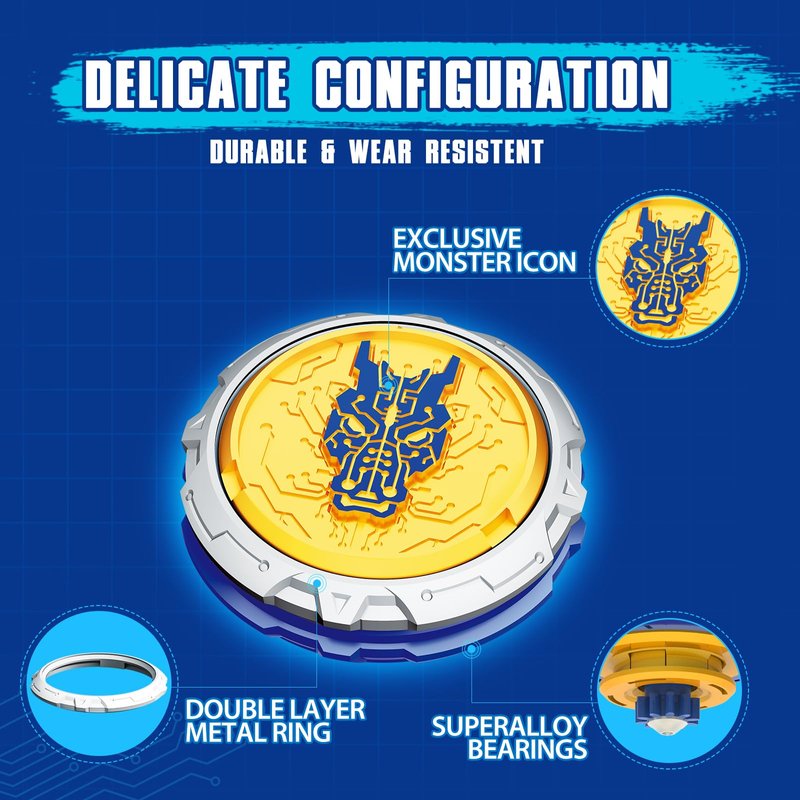 - EXQUISIVE DETAILS: The shape of the launcher is designed into a tiger's head symbolizing power. Meanwhile, the gyro not only owns the attracting appearance but also owns the feature of durability and balance due to the composition of exclusive monster icon, durable metal ring and POM bearings. All the exquisive details make the set more intersting and attracting.