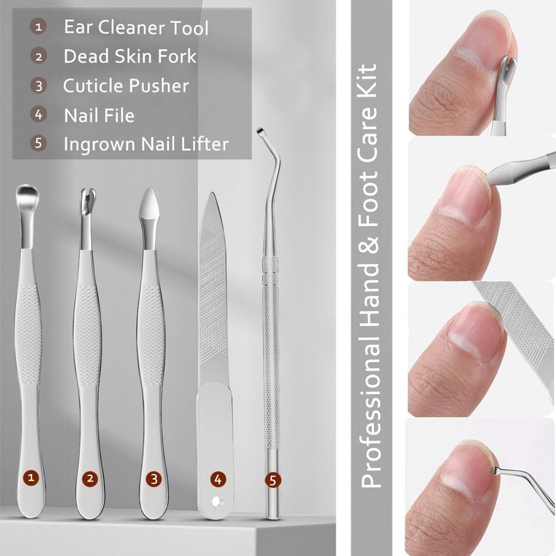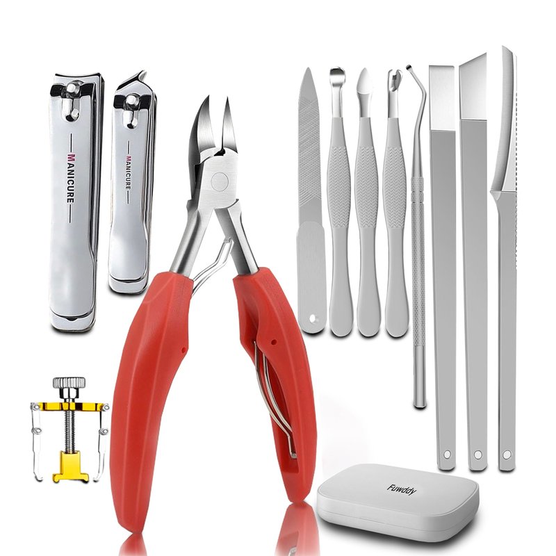 - 12-IN-1 NAIL CARE TOOLS : Includes ingrown toenail clipper, pedicure knife, fingernails cutter, nail file, ingrown nail lifter, cuticle pusher, dead skin fork, toenail corrector, ear cleaner tool, organizer box. This nail clipper set can meet all the needs of fingernail and toenail care.