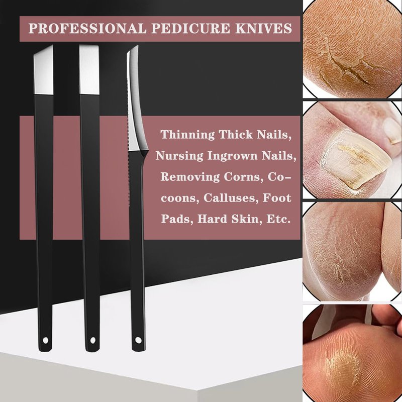 - PEDICURE KNIFE FOR FEET: Pedicure knife with 3 different blades help to solve different pedicure treatment with ease. Great for trimming thick nails, ingrown nails, picking corns, removing cocoons, callus and cuticle.