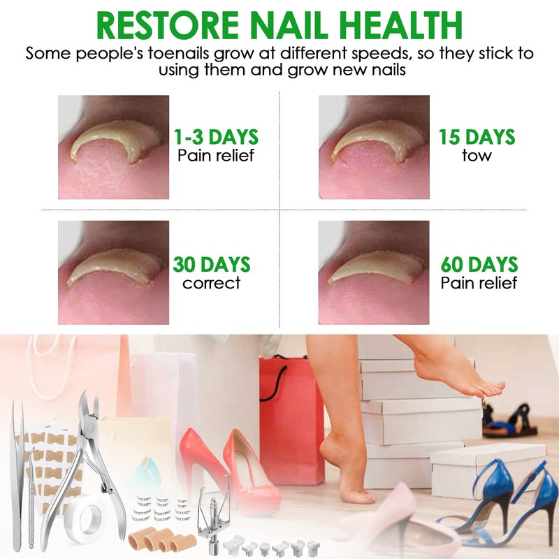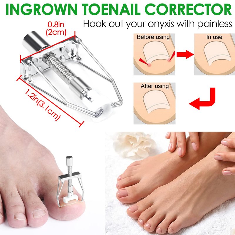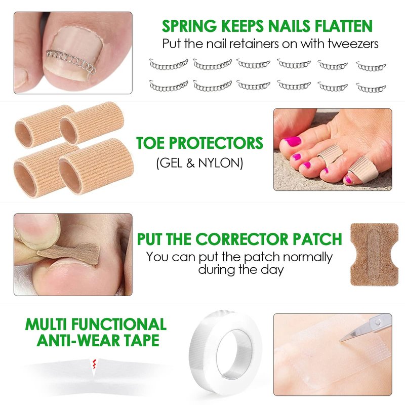 - Package Include: Tweezers x 1, Ingrown toenail corrector x 1, Toenail clippers x 1, Nail lifter x 1, Medical tape x 1, Toenail corrector patch x 3 (10 pieces for each sheet), Toe protectors x 4, Nail pressurizer x 5, Nail retainers x 12.