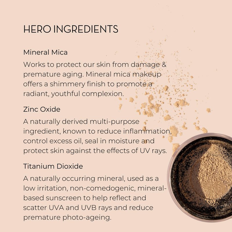 The ultimate mineral powder, INIKA Loose Mineral Foundation offers flawless, buildable coverage with 100% natural ingredients. Its buildable, silky texture blends effortlessly for a perfectly natural-looking, airbrushed complexion that won’t dry out the skin and your desired level of coverage. Free from fillers such as Talc and harsh chemicals, the pure earth-derived minerals work to even the skin tone and disguise conditions such as acne, scarring, rosacea, or pigmentation. Meanwhile, Mineral Mica offers a gentle radiance and glow to the skin. Titanium and Zinc Oxide provide Natural sun protection (SPF 25) to safeguard against harmful UV rays.