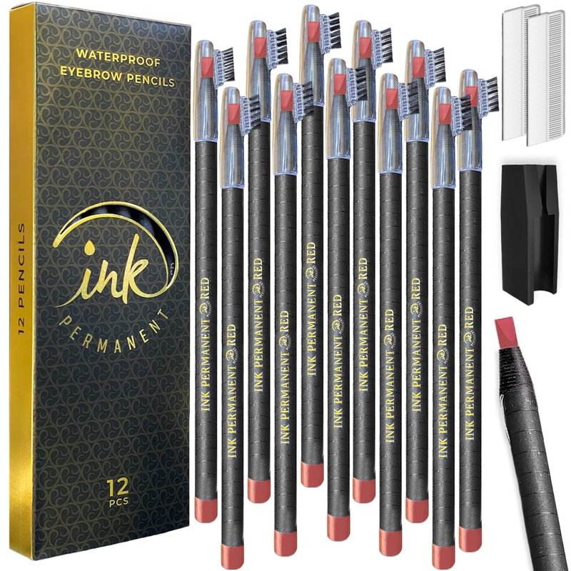 Ink Permanent Waterproof Eyebrow Mapping Pencils for Permanent Makeup, Microblading, and Blades Henna Applications 12 Piece Brow Mapping Peel Off Pencil Set with Shaper/Sharpener and For Marking (Red)