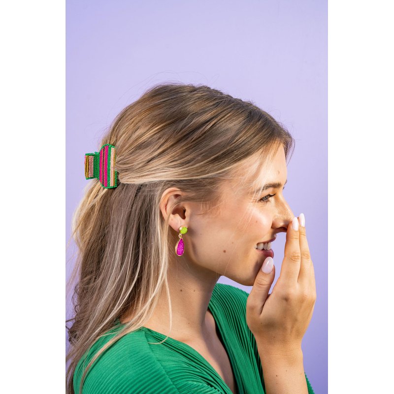 - Small Hair Clips: Create a playful look with the Gia Petite Claw Clips. This hair clip showcases a bright and lively combination of colors, arranged in a captivating pattern. The glass seed bead design adds a touch of fun and vibrancy to your hairstyle. With dimensions of 2.16" in length, 1.68" in width, and 1.58" in height, it's perfect for adding a pop of color to your hair. These mini claw clips are not just accessories; they're handmade hair accessories designed for the modern bohemian, embodying a fusion of style and functionality in a petite package.