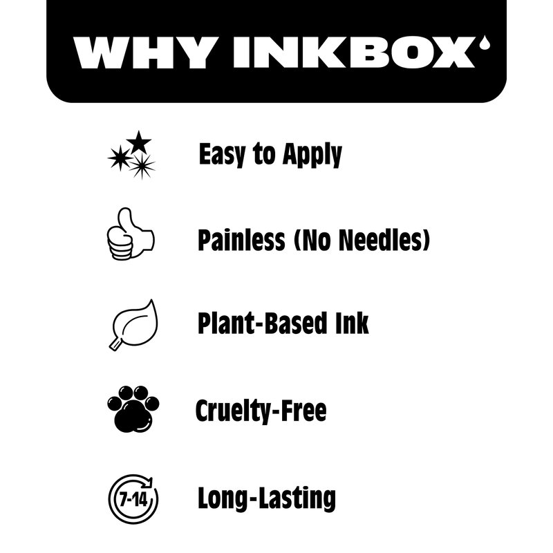 • Cruelty Free and Safety Tested: Inkbox is made from a cruelty free formula and is safety tested! Caution: For external use only. Do not apply anywhere on the face. Do not apply to neck, upper chest, intimate areas, or irritated or damaged skin.