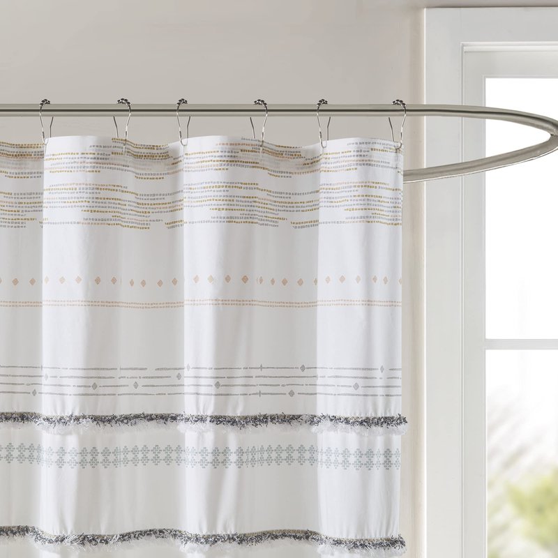 - This 100% cotton shower curtain features boho stripe pattern print and tassels creating a chic design appeal.