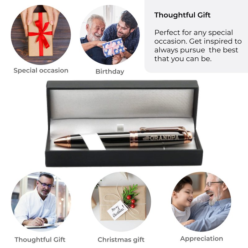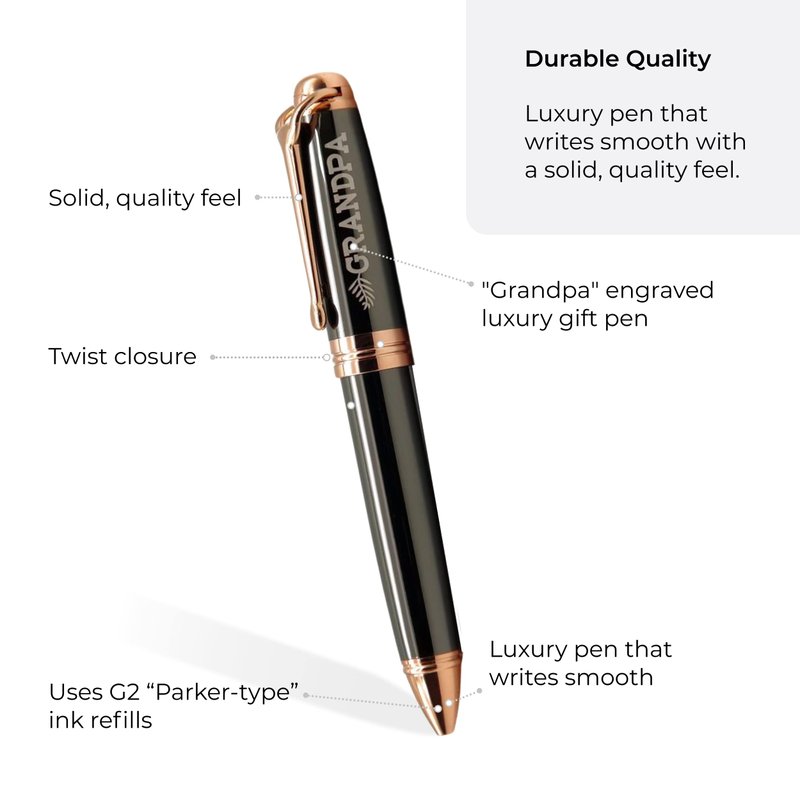 This "Grandpa" engraved luxury pen features a twist-action ballpoint writing tip. It comes in a satin-lined keepsake presentation box for easy gifting, and makes a suitable appreciation gift for any grandpa for a variety of occasions, including Christmas, retirement, birthday, Grandparent's Day, and Father's Day. This pen comes with black ink; the body color is gunmetal with rose gold-colored accents. An alternative to disposable ballpoint pens, this reusable pen is easy to refill and is compatible with G2 "Parker-type" ink cartridges.