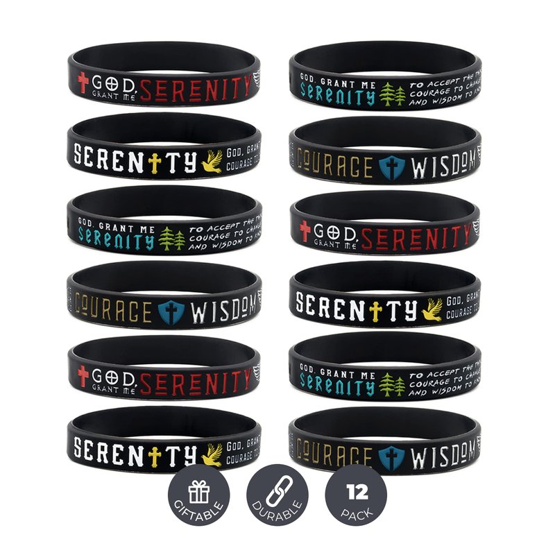 - Pack of 12 silicone rubber wristbands with the full Serenity Prayer for serenity, wisdom, and courage