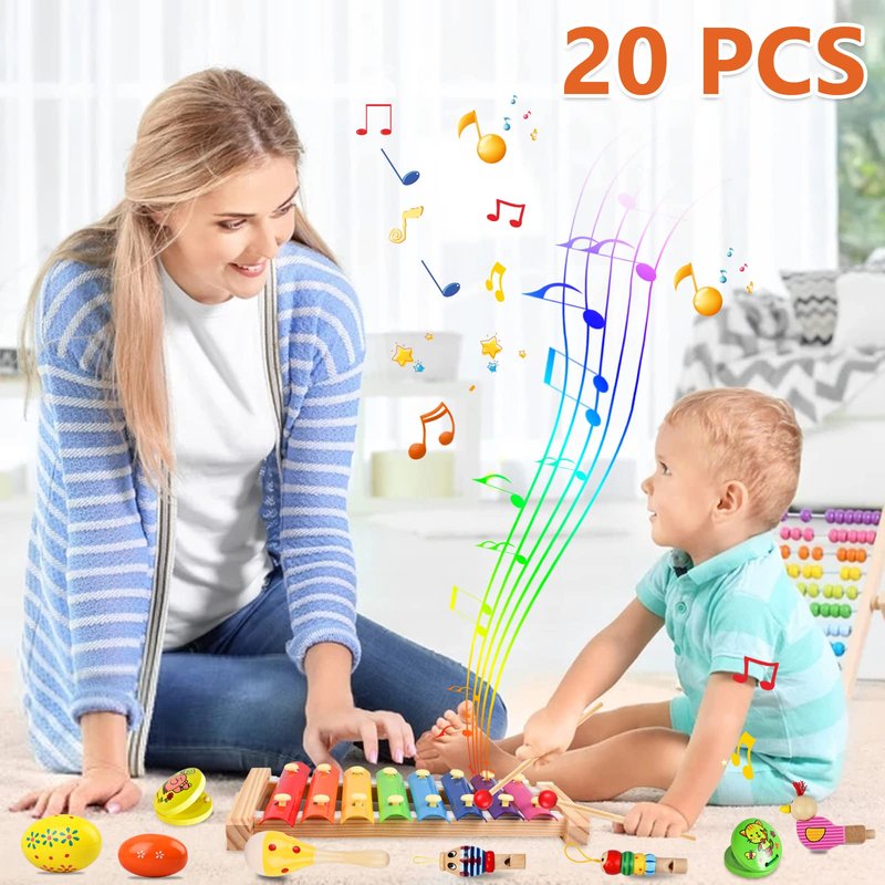 INLAIER Kids Musical Instruments Set, 20 Pcs Wooden Shakers Percussion Instruments Tambourine Xylophone Toys, Child Early Learning Musical Toys for Boys and Girls Gifts Present with Carrying Bag