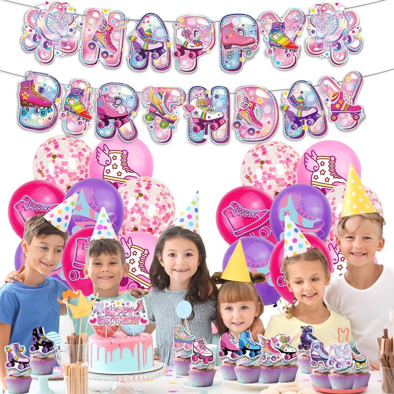 - 1.Rainbow Glitter Roller Skating Party Decoration: 1pc rainbow glitter happy birthday banner, 1pc large cake topper, 24pcs cupcake toppers, 16pcs latex balloons, this roller skating birthday banner can set the mood of the roller skating birthday party.