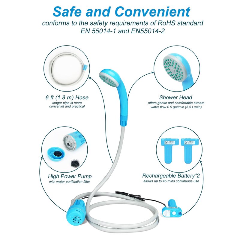 - 【Safe and Convenient Outdoor Camp Shower】innhom camp shower conforms to the safety requirements of RoHS standard, EN 55014-1 and EN55014-2. The water filter system ensure the water is clean and protect the shower head from being clogged. The O-ring protects water from escaping from the connection of the shower hose and showerhead.