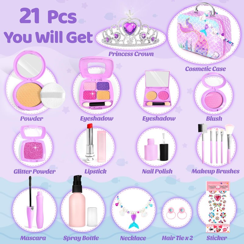 - DESIGN INSPIRATION - We listened to concerned mothers who wanted a kids makeup sets for girls toy that's safe for their little ones. Many mothers mentioned that their children, even though they are quite young, have already started showing an interest in makeup and a desire to enhance their beauty. As a response, we have introduced a fun and imaginative mermaid gift pretend play for toddlers 3-5 collection. Our toddler play makeup set for kids 3-5 provides a safe and worry-free way for kids to explore makeup play.